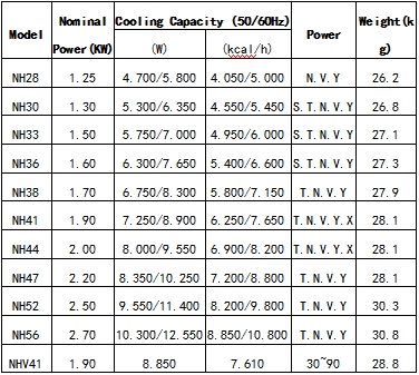 將來自蒸發(fā)器內(nèi)低溫、低壓的制冷劑氣體壓縮成為高溫、高壓的制冷劑氣體,送入冷凝器冷凝,成為高壓中溫的液態(tài)制冷劑,經(jīng)過節(jié)流元件(膨脹閥或毛 細管)節(jié)流降壓后再送入蒸發(fā)器,由于蒸發(fā)器內(nèi)部空間較大,液態(tài)制冷劑在蒸發(fā)器內(nèi)部汽化并吸收熱量,使蒸發(fā)器表面溫度迅速下降,再配以風(fēng)機、風(fēng)葉的旋轉(zhuǎn), (水冷機組以水作為載冷劑流過蒸發(fā)器表面帶走冷量)使空氣與蒸發(fā)器對流,完成冷量的交換,將冷量散發(fā)到室內(nèi)或工作所需場所。